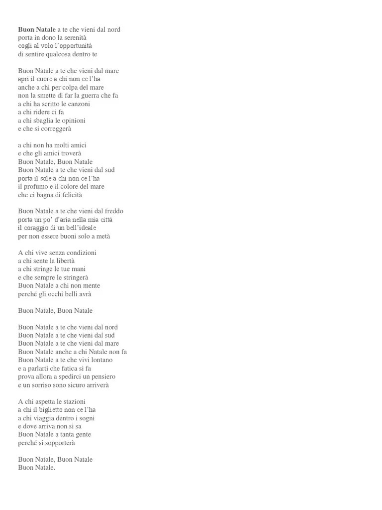 Di sentire qualcosa dentro te buon natale a te che vieni dal mare apri il cuore a chi non ce l'ha anche a chi per colpa del mare non la smette di far la guerra che fa a chi ha scritto le canzoni a chi ridere ci fa a chi sbaglia le opinioni e che si correggerà A chi non ha molti amici e che gli. Buon natale a te che vieni dal nord porta in dono la serenità cogli al volo l'opportunità di sentire qualcosa dentro te buon natale a te che vieni dal mare apri il cuore a chi non ce l'ha anche a chi per colpa del mare non la smette di fare la guerra che fa a chi ha scritto le canzoni a a chi ridere ci fa a chi sbaglia le opinioni e che si correggerà a chi non ha molti amici e che gli amici.